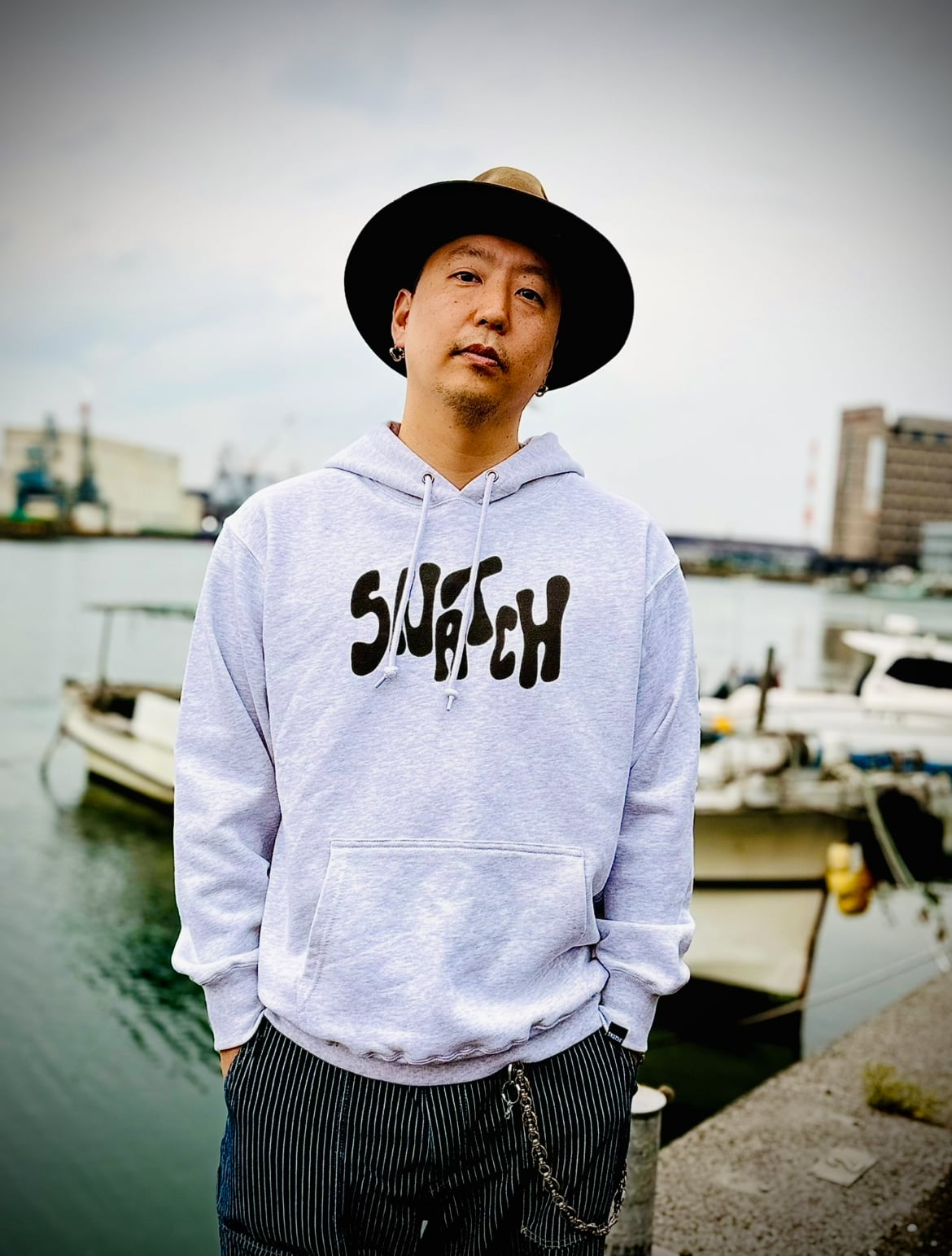 ◾️フロントに大胆にあしらわれた「SNATCH」ロゴが目を引く、ユニークなデザインのフーディー